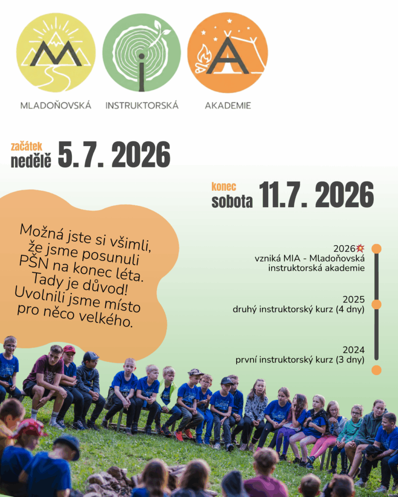 Pro léto 2026 přicházíme s velkou novinkou – Mladoňovskou Instruktorskou Akademií (MIA)! Uvolnili jsme ten nejlepší termín léta, abychom nastartovali novou generaci vedoucích.